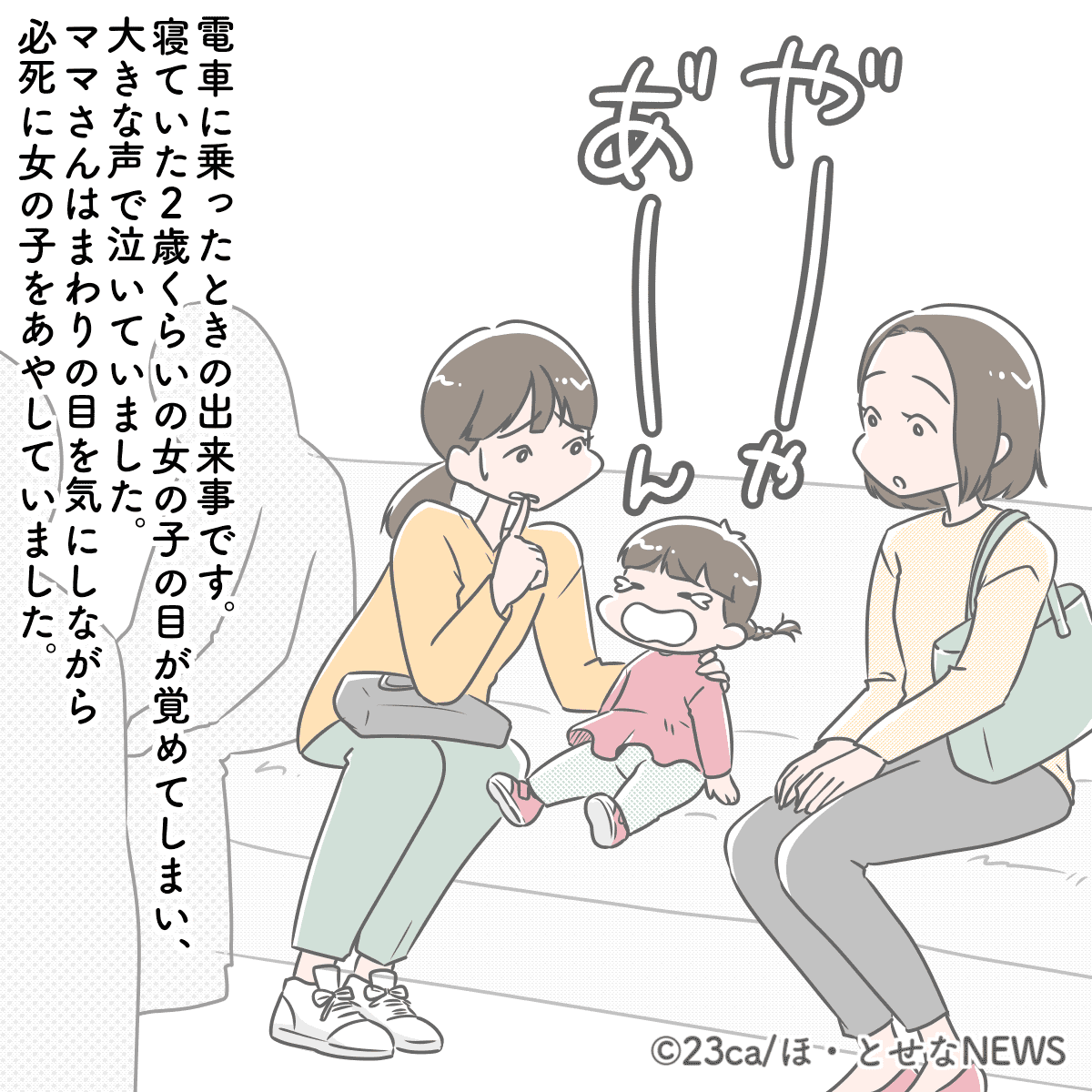 静寂な電車内で泣き叫ぶ2歳くらいの女の子 周りの目を気にする母親を見て、咄嗟に取った行動に「少しはお役にたてたのかな…!」