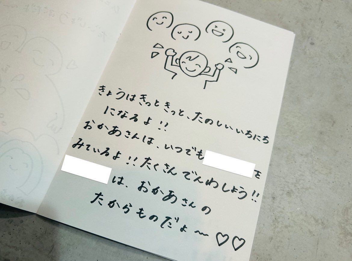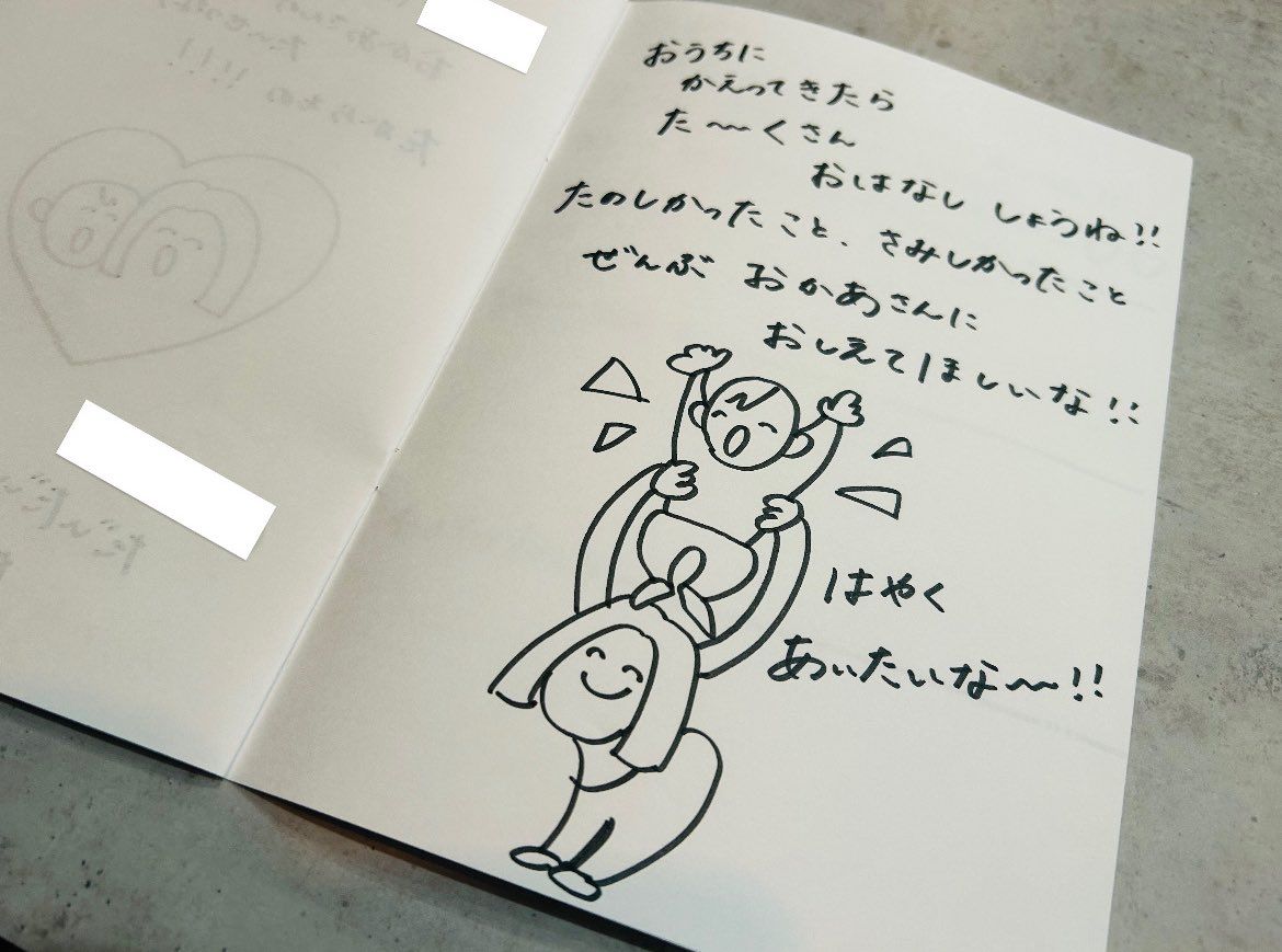 nomiさんは、旅行で3日間離れる息子さんのために絵本を描くことにしました。息子さんが寂しくなったときに読めるように、絵本には息子さんを励ます言葉や、お母さんの気持ちなどが書かれています。