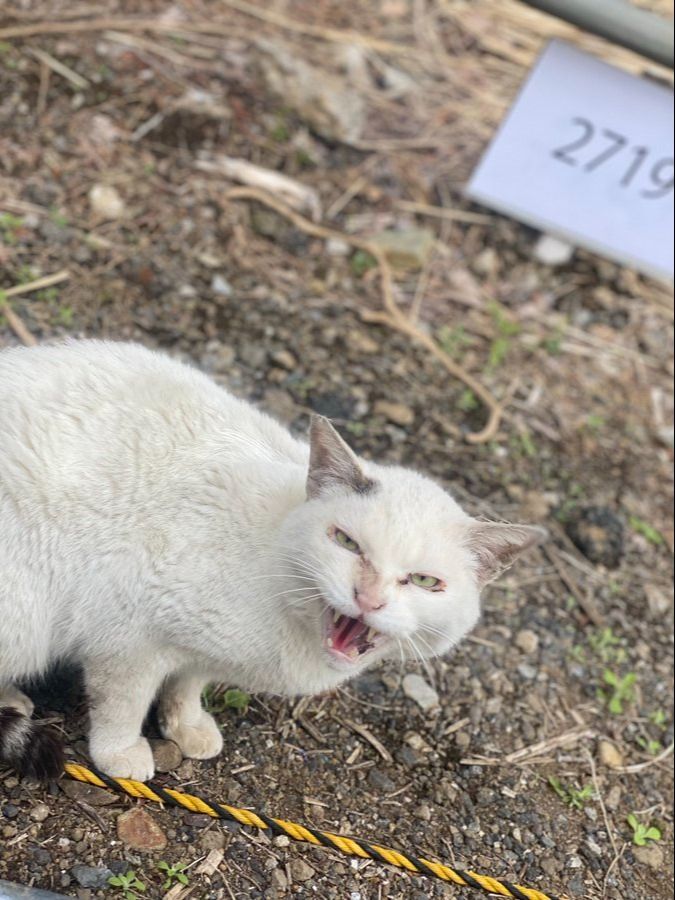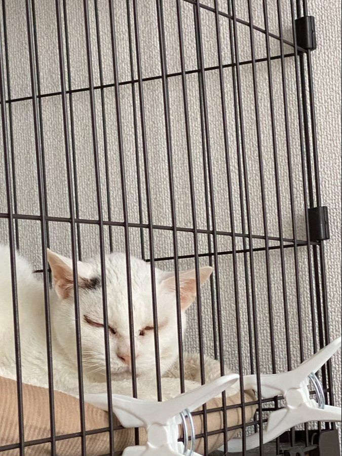 野良猫時代の姿は、毛や眼頭に汚れが付きどこかおびえている姿に見えます。しかし、保護されてからは雰囲気が穏やかになり、飼い主さんを見上げている姿がかわいらしいですね。