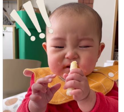 いつもは泣くか、お母さんを探してドアの方を見つめて待っている娘さん。このときは寝ぼけていたのか、手をにぎにぎしてぶんぶんと振っていました。