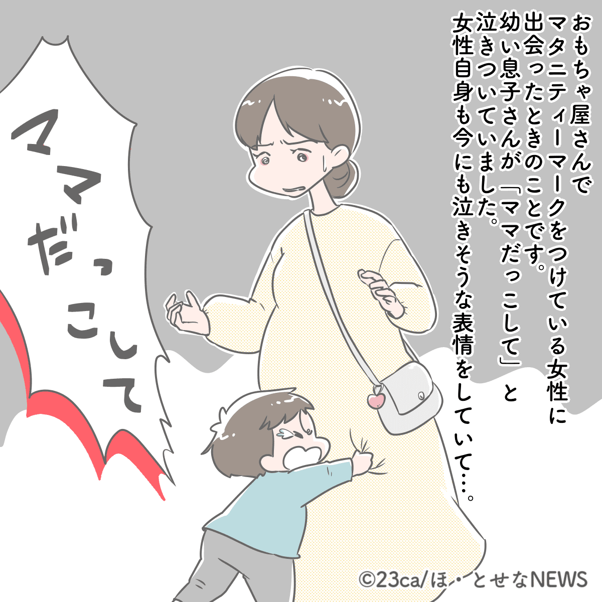 ユカさん(仮名)がおもちゃ屋さんへ息子さんと買い物にいったときのことです。2歳くらいの男の子がママにしがみつき「抱っこして!」と泣いていました。ママはマタニティマークをつけていて、おそらくつわりがひどく抱っこができずに困っている様子。