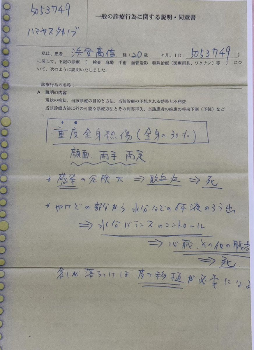 ときに心肺停止になり気を失ったこと、皮膚から細菌を落とすために新しくできた皮膚をすり落とす処置をされたことなど、命をつなぐための治療と経過のすべてを濱安さんは認識していたといいます。