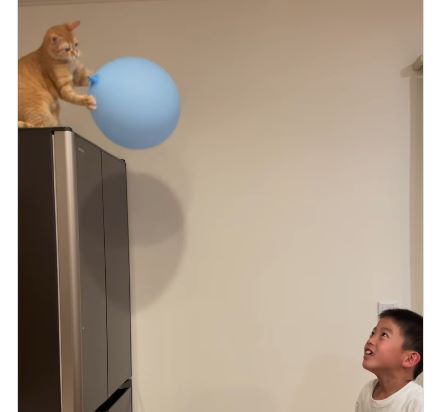 そのときちょうど冷蔵庫の上にいたむぎちゃんが、風船をポンっと落としたのがきっかけなのだとか。