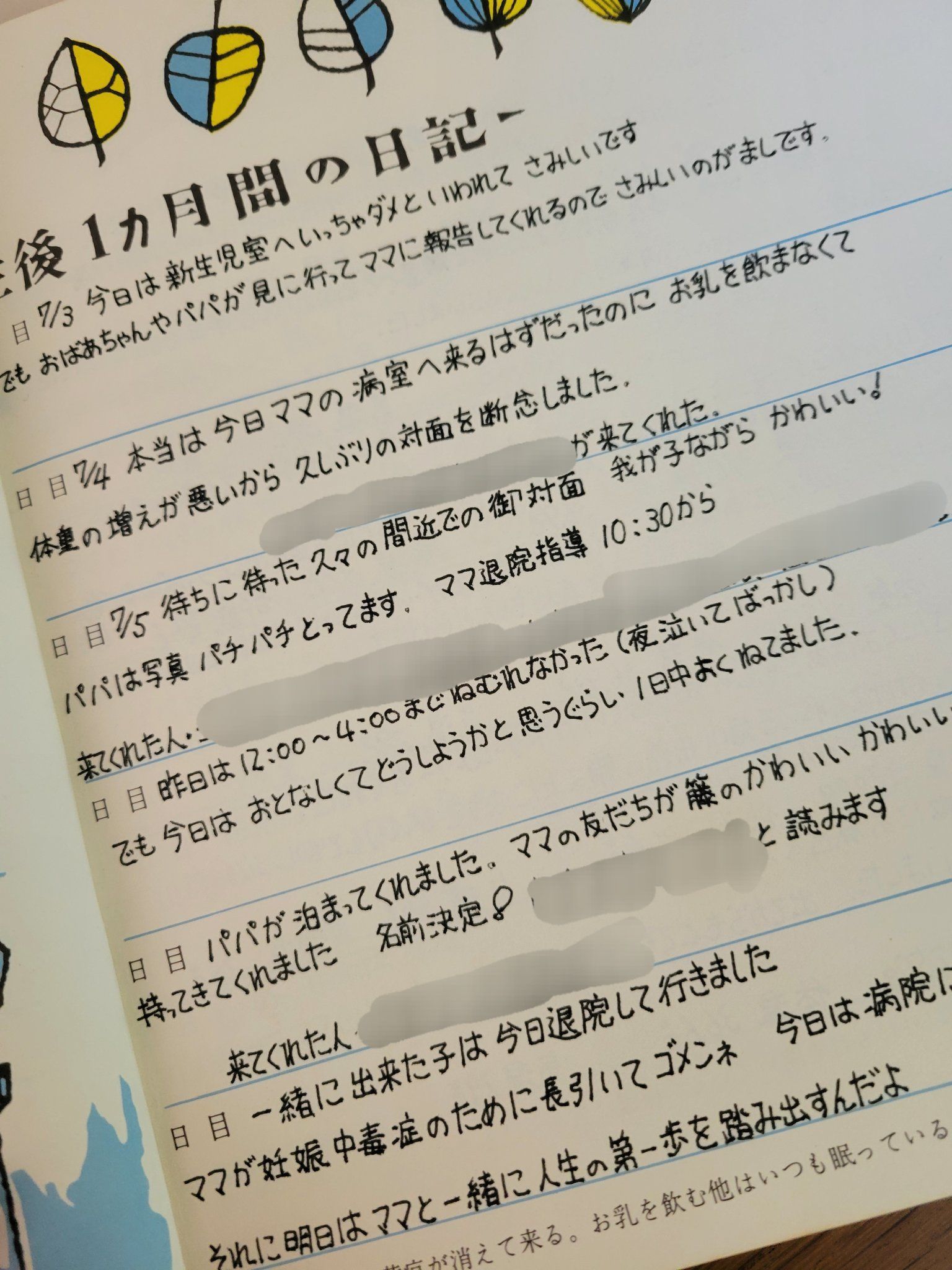育児日記には、産前から出産までのお母さんの思いや、そのときの出来事が丁寧に書かれていました。