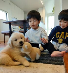 3人はとっても仲がよく、よくじゃれ合っています。エルくんはとても優しく穏やかな性格で、息子さんたちにはちゃんと手加減してくれている様子。とはいえ、じゃれ合っているときは、ママさんとパパさんがそばで必ずついて見ているように安全面には気をつけているといいます。