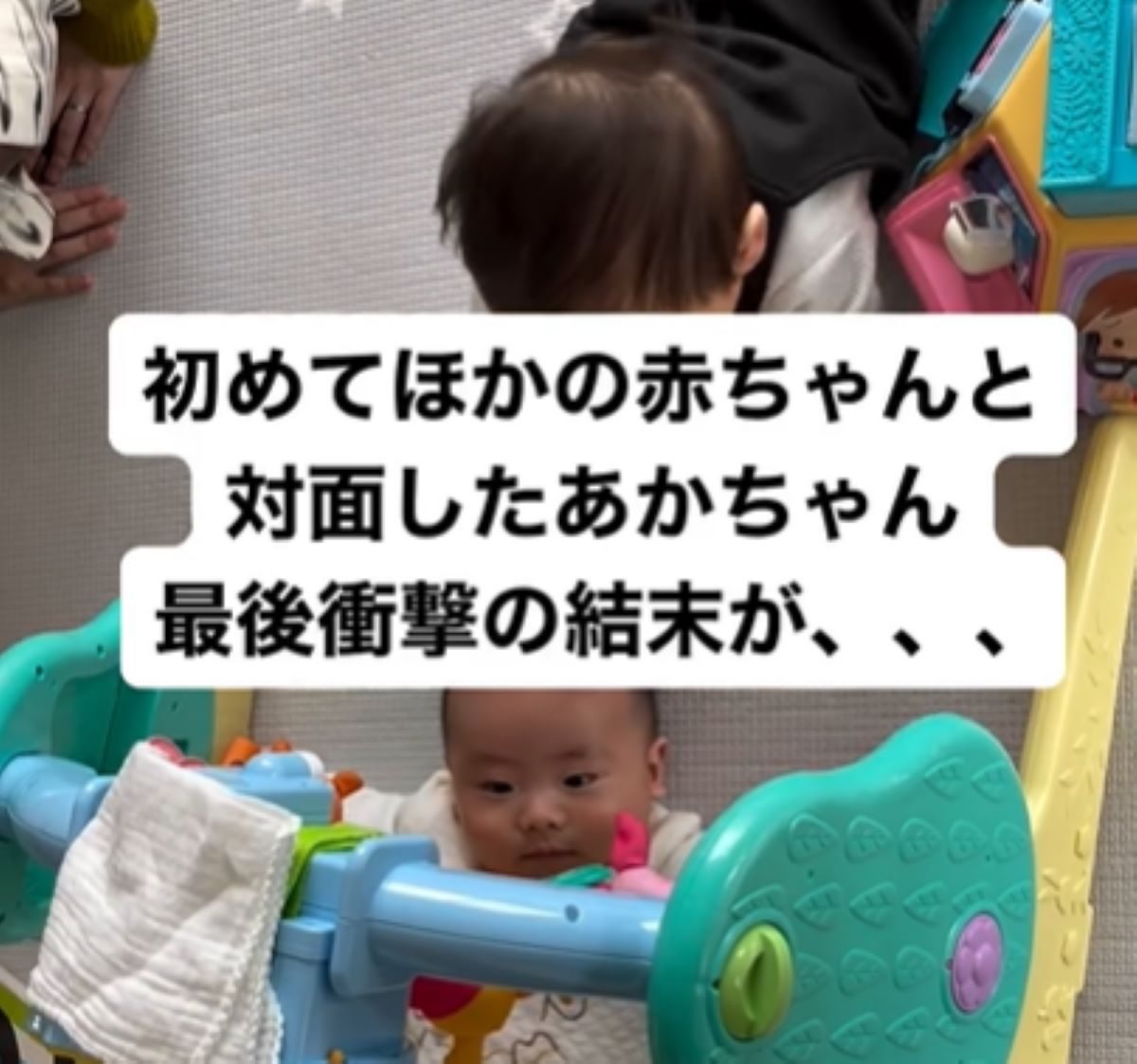 同年代の赤ちゃんと会うのは、初めてだった息子さん。寝ながらおもちゃで遊んでいた息子さんですが、ハイハイして近づいてくる赤ちゃんを気にしている様子です。