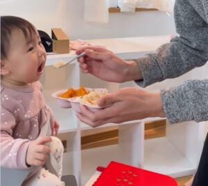 これまでは、いろはちゃんに離乳食を食べさせたことがなかったお兄ちゃん。いろはちゃんの食事が離乳食完了期になり、自らあげてみようと思ってくれたようで、初挑戦することに。