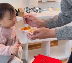 ニコニコしながら「食べて」と優しく話しかけるお兄ちゃん。すると、いろはちゃんは口を開け、ぱくっと食べてくれました。