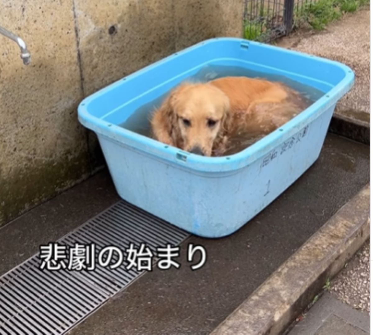 そんなぷりんちゃんは、年に2、3回訪れる国立公園のドッグランへ行きました。@purin524golさんが少し目を離した隙に「ワンちゃん用タライ」に入って、入浴を開始していたぷりんちゃん。楽しそうにクルクル回りながら体を濡らしています。