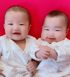 双子の姉妹である娘さん。同じ体勢で寝たり、同じタイミングで泣いたり、お腹が空くタイミングもほとんど双子の姉妹で同じというのだから驚きです。