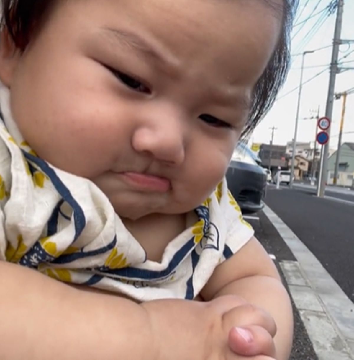 赤ちゃんは眉をひそめながらパパさんを待っていますが、つい目を閉じてコクンと眠ってしまいそうに…。