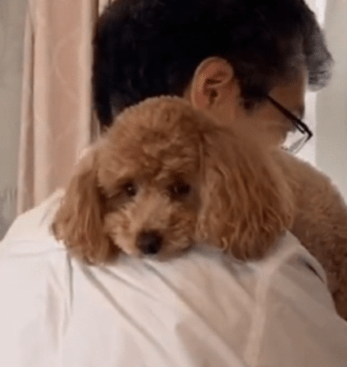 動画には、トイプードルのイチゴくんをあやすように抱いている投稿者さんのお父さんの姿が映っています。