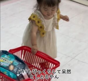 そして、次に向かったのは、オムツが置いてあった棚でした。娘さんはオムツを持って来て、カゴに入れ持ち上げようとします。ママさんはオムツを購入する予定だったといいますが、まさか娘さん自身でオムツをカゴに入れるとは驚きです。