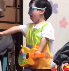 おもちゃのギターを叩き、まるで本物のギタリストのように演奏します。さとるくんはギターを弾いたことがなかったのですが「アニメ映画の影響が大きいと思います」と話すママさん。
