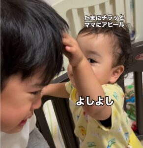 なぎちゃんは、泣いているお兄ちゃんの頭をなでなで。どうやら、なぎちゃんはお兄ちゃんを慰めているようです。そんな様子にほっこりしたママさんは「このようないざこざはしょっちゅうで、お兄ちゃんが泣いているのも珍しくはないのですが、双子がそれを見てどうすればよいか考えて行動していることに、成長を感じ嬉しく思いました」と話していました。