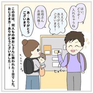 1日の間でたくさんのおじさんたちに助けてもらったとまとママさん。この日の出来事にびっくりし、嬉しくて感激したとまとママさんは、SNSに投稿しました。すると、多くの反響があったため、漫画にすることに。
