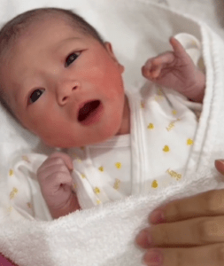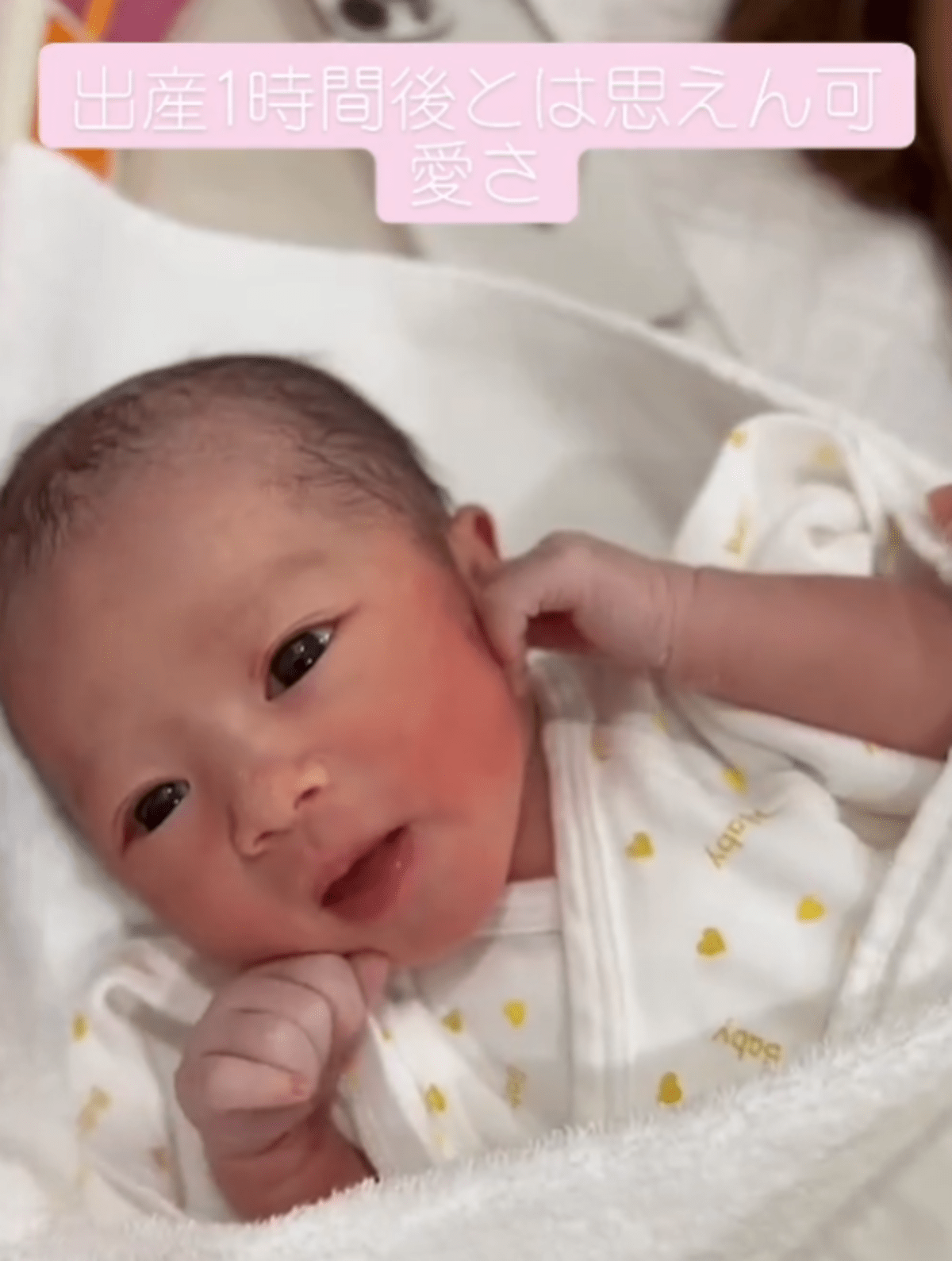出産からわずか1時間後にもかかわらず、顔立ちがはっきりしている可愛らしい赤ちゃん。