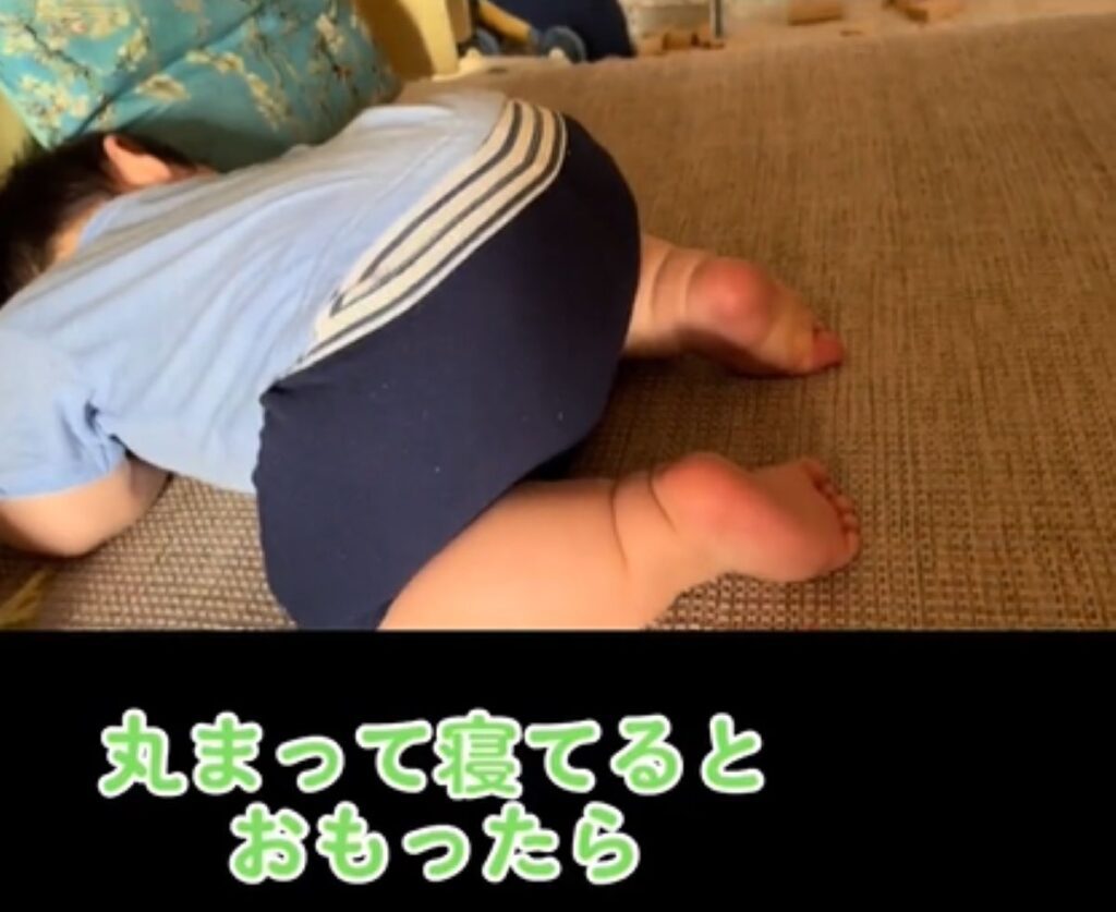 ソファでおにぎりを食べる1歳息子 しかしよく見ると…母「!?」すべてを察した母の投稿に「可愛いから許す!」「現行犯〜」
