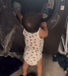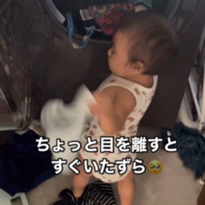 洗濯の乾燥が終わり、扉を開けて洗濯物を出そうとしていたママさん。しかし、同時にやかんが沸騰したため、急いでクッキングヒーターを止めに行きました。すると、息子さんが洗濯機の方に全力でハイハイしていく音が聞こえます。その後静かになったため、いたずらをしているに違いないと思ったママさんは、撮影をすることに。