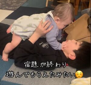 その後、宿題を終えるとお兄ちゃんは弟くんを抱き上げ楽しそうに遊んでいました。