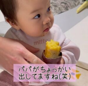 お芋を食べる生後11ヶ月の娘 パパがちょっかいを出した直後…「可愛い」「大好きさがめっちゃ出ていますね」
