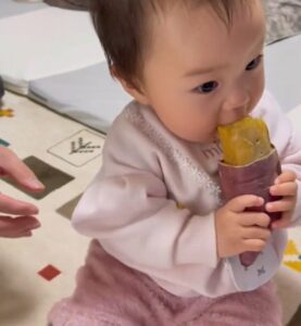 当時11ヶ月の娘さんは、大好きな焼き芋を食べていました。両手で抱えて美味しそうに食べる娘さん。その様子から焼き芋が大好きなことが伝わります。