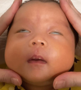 新生児らしい可愛い変顔を披露する生後1ヶ月の娘さん。
