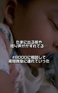 しかし、しばらく息子さんの様子を見ていたところ「何かおかしい…」と感じます。たまに出る咳やうなり声がかすれていたのです。違和感をもったちーのさんは、まず小児救急電話相談(#8000)に相談し、夜間救急を受診することに。