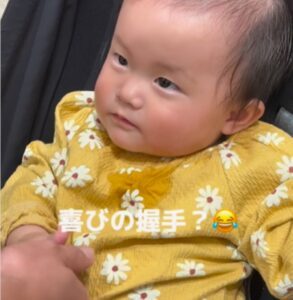 娘さんの反応に「私に似て、ツンデレタイプ?(笑)と思い微笑ましかったです」とママさん。パパさんが娘さんの手を触ると、握手のようになりました。