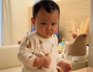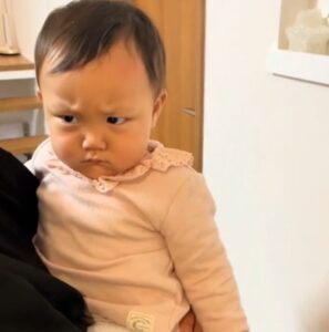 娘さんは生後11ヶ月頃からこのような表情をするようになったそう。パパさんとママさん以外の大人と会うときは、警戒からなのか家でも外でも必ずこの顔になります。しかし、小学生くらいの年齢のお姉ちゃんから自分と同じくらいの子どもには人見知りせずニコニコと笑っていて不思議に思ったというママさん。髪の毛を切った後のパパさんを睨んでいたこともあったのだとか。
