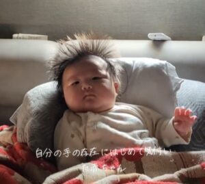 髪の毛フサフサベビー その様子に「人生1周目すぎて可愛い」「情報量多すぎ」「おれの朝やん」