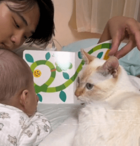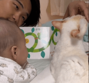 赤ちゃんにパパさんが絵本の読み聞かせをする温かなひととき。その隣には、赤ちゃんだけではなく飼い猫も一緒に座っていました。まるで兄弟のように大人しく座って絵本の読み聞かせを聞いている姿がTikTokに投稿され「可愛い」と話題となっています。