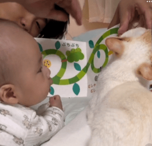 ある日、生後5ヶ月の息子さんにパパさんが絵本の読み聞かせをしていると、途中で飼い猫のはるくんが近くへやってきました。