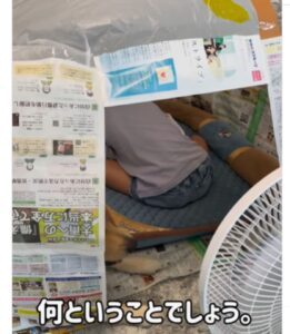 娘さんが作ったのは「シンくんやお姉ちゃんと一緒に入れるくらい大きいお部屋」でした。お部屋の中に扇風機で風を送ると、中は広い空間になります。娘さんの理想通り、みんなが入れるお部屋の完成です。