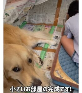 2歳のゴールデンレトリバーのシンくんが見守るなか、娘さんは新聞紙を広げて繋ぎ始めました。娘さんは頭の中でイメージできているようで、段取りよく進めていきます。途中でシンくんに邪魔されながらも、終始仲良く工作をしていました。