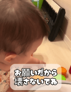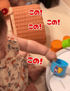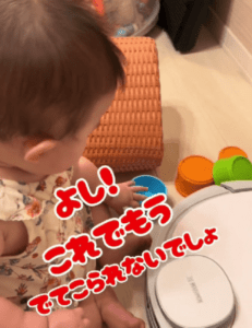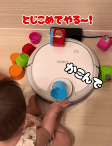 現在では、ロボット掃除機にも慣れた様子。動画内で使われているカップのおもちゃは、娘さんのお気に入りだといいます。ロボット掃除機の近くにあったおもちゃ箱から自分で取り出して遊んでいました。