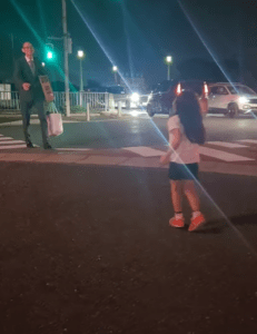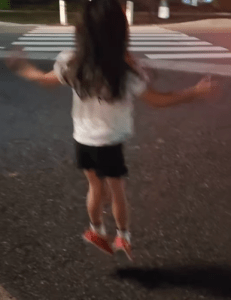 通りの向こう側でパパさんを見つけた瞬間… 娘さんは大きくジャンプして全身で喜びを表現します。