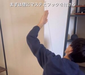 まずは、壁にツリーの形にマスキングテープを貼り、そこにコードフックを付けていきます。