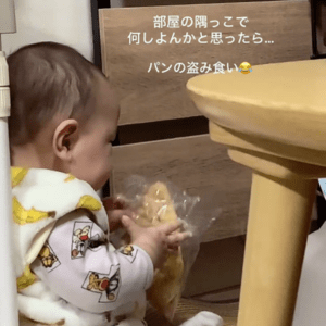 @panda.3939pandaさんが、生後7ヶ月の息子さんがこそこそと隠れて何かをしている可愛い姿をTikTokに投稿すると「美味しいものは本能でわかるんでしょうね」「こんなにも可愛い盗み食いがあるとは…」などのコメントが寄せられて話題になっています。