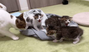 子猫たちは生後1週間のときに@matsutake_catさんのお家で保護しました。先住猫がいるため、普段は母猫と子猫たちでひとつの部屋の中で過ごしています。