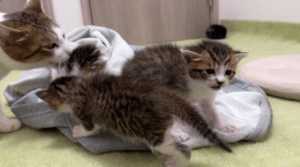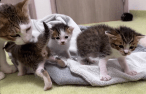 子猫たちはすっかり大人しくなりました!生まれてはじめての恐怖におびえる子猫たちに「そんなに怖がることはないよ」と言い聞かせるように寄り添う母猫。