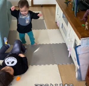 よちよちと歩く三男くん。ママさんのところへ向かっているのかと思いきや、途中で3歳の次男くんを見つけ、次男くんのところへ。