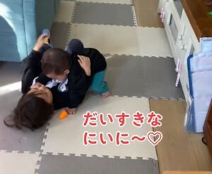 次男くんも嬉しかったのか、三男くんを優しくハグします。普段から2人が仲良くしている姿を見るママさんですが、次男くんが三男くんを溺愛している様子から、最近は三男くんも次男くんが大好きでくっついていく姿に相思相愛でほっこりしているそう。