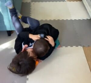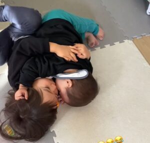 三男くんと次男くんはいつも一緒に遊び、笑い合っています。次男くんが恐竜の真似をすると、三男くんも真似してついて行き、一緒に絵本を楽しむなど仲良く過ごしているようです。