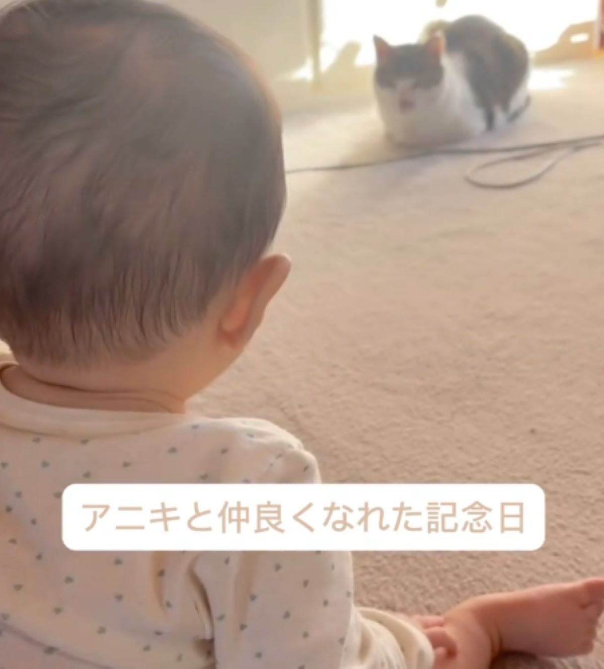 猫と仲良くなった生後6ヶ月赤ちゃん その2人の様子に「うちの子も」「成長を感じますね」「最後思わず停止してみちゃった」