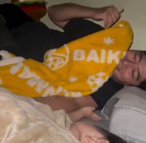 しばらくして気づいたのか、笑いながらタオルケットをかけるパパさん。しかし、朝起きて動画を見せたときには、このときのことはまったく覚えていなかったといいます。
