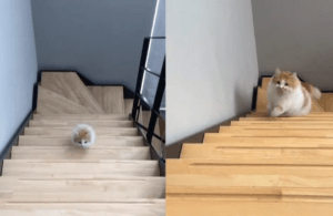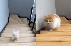 投稿には、猫のぽてちくんの生後3ヶ月の頃と、4歳になった現在の姿がありました。どちらも、可愛らしく階段を上がってくる姿が映されています。