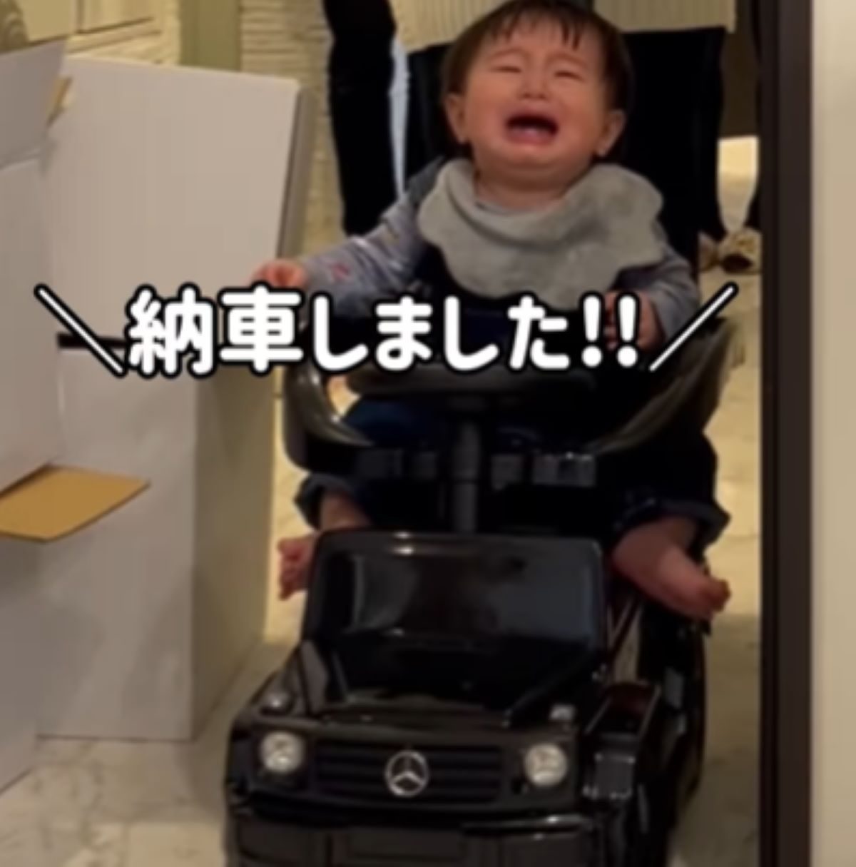 乗車した状態でお披露目したいということで、親戚3人で頑張って組み立ててくれていましたが、大勢の人たちに囲まれた息子さんは大泣き。多くの人たちに見つめられて驚いてしまったようです。