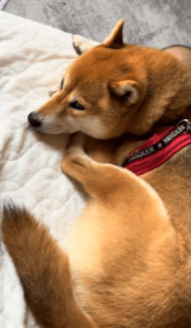 お腹も膨れて眠くなったのか、早々に横になって寝てしまった息子さん。すると、そこへ背中をピッタリと合わせるように寝転ぶ柴犬のラテちゃん。