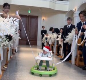 アットホームな結婚式を目指していたママさんとパパさん。最初は無線操作のおもちゃの車に息子さんを乗せて登場させる予定でしたが、ゲストの皆さんにも参加してもらえるよう、歩行器を使う演出に変更しました。